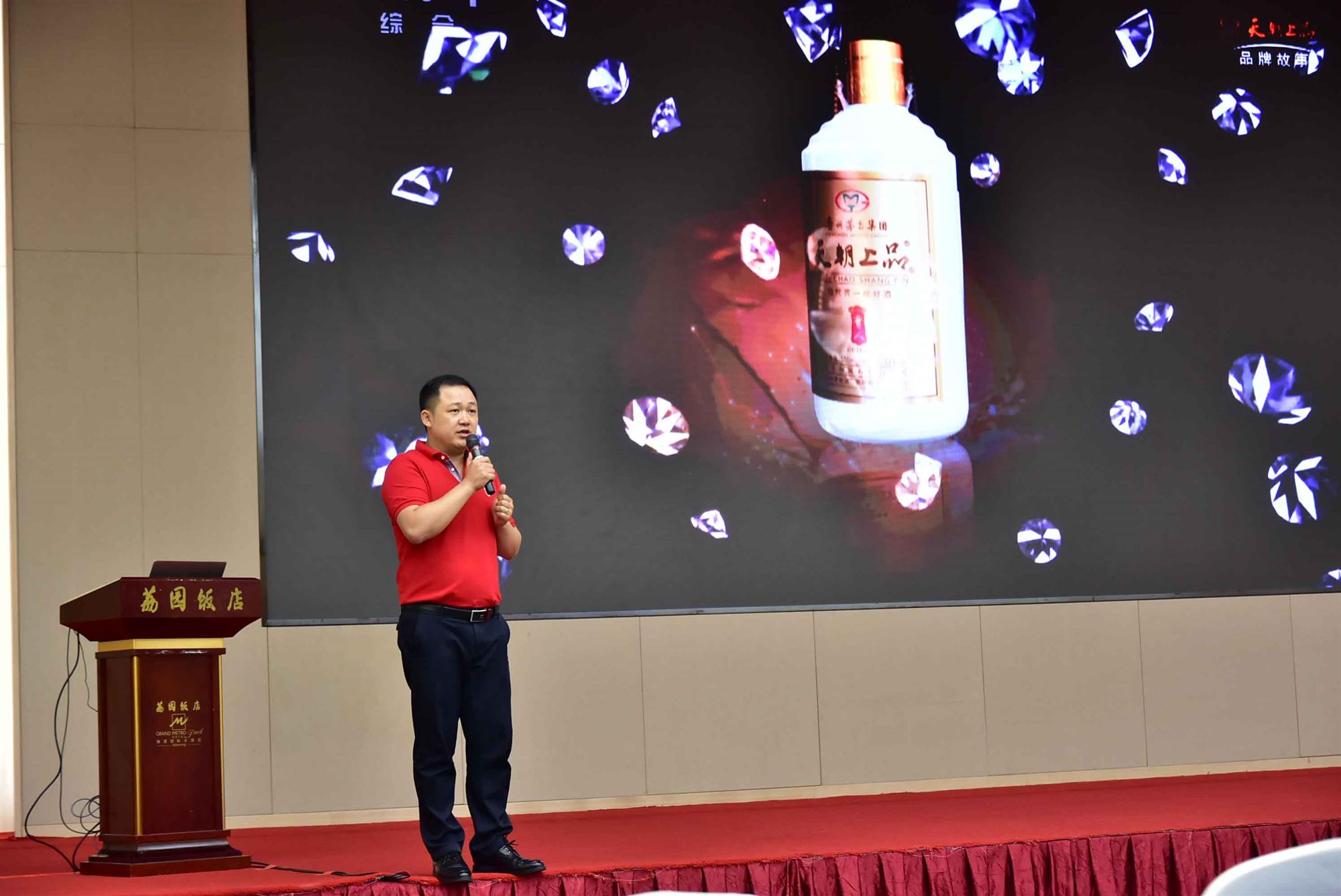晚宴用酒由广西金朝贵人商贸有限公司提供,金朝贵人公司总经理卿熙东先生介绍了广西宏道办公生活产品之一——天朝上品酒的酿造工艺、获奖情况、宣传力度等基本情况。