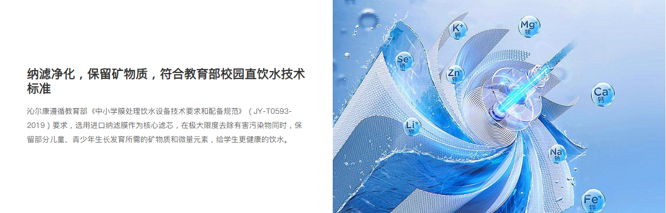 纳滤净化,保留矿物质,符合教育部校园直饮水技术标准