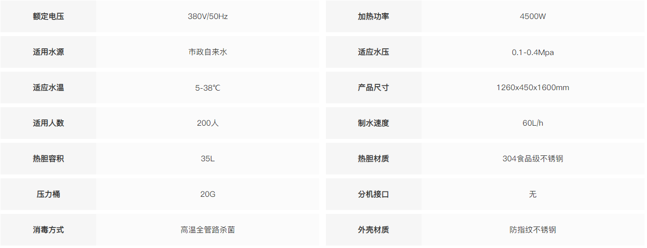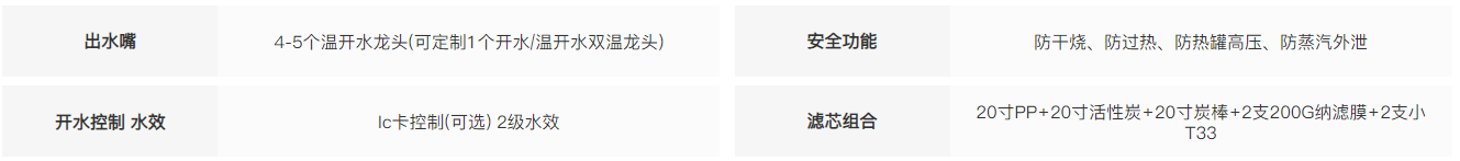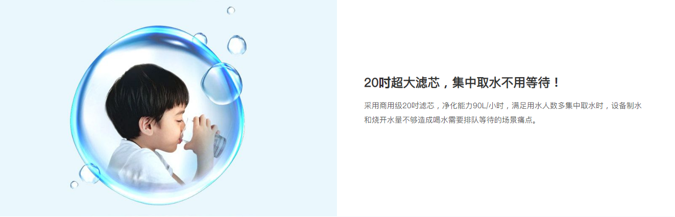 采用商用级20吋滤芯,净化能力90L/小时,满足用水人数多集中取
