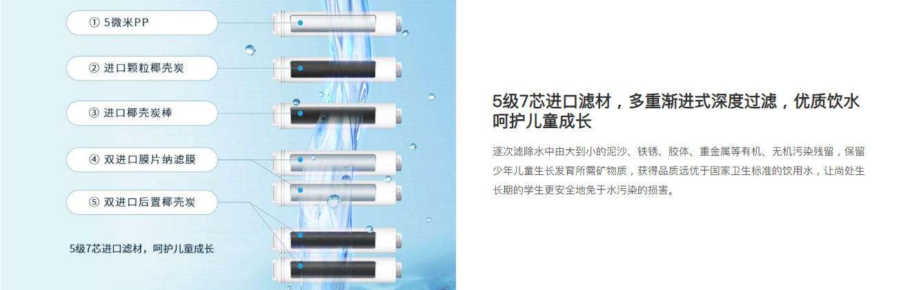 5级7芯进口滤材,多重渐进式深度过滤,优质饮水呵护儿童成长