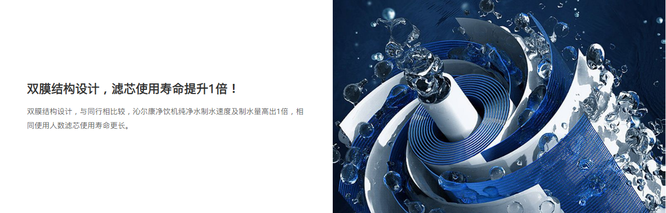双膜结构设计,制水速度及制水量高出1倍,滤芯使用寿命更长。