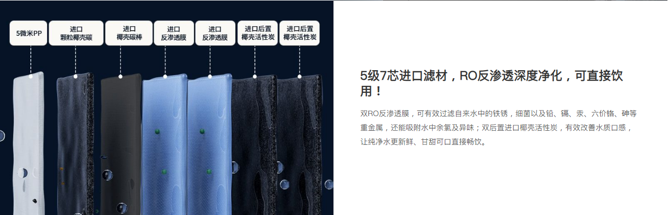 5级7芯进口滤材,RO反渗透深度净化,可直接饮用!