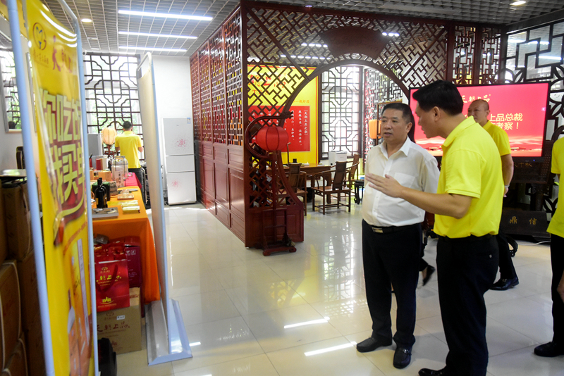 在广西金朝贵人商贸有限公司总经理庞杰伟先生的陪同下,黄永毅总裁参观了金朝贵人公司的产品形象展示厅,并详细询问了每一种产品在广西的销售情况。