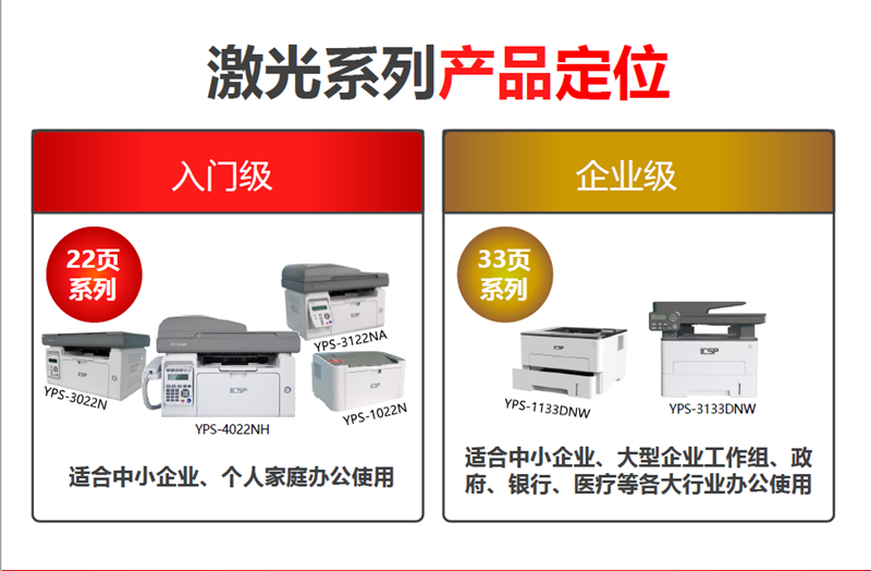林总说,爱胜品激光系列产品的定位主要分为入门级和企业级两类。入门级产品包括YPS-1022N、YPS-3022N、YPS-3122NA和YPS-4022NH,适合中小企业、个人家庭办公使用;企业级产品有YPS-1133DNW和YPS-3133DNW,适合中小企业、大型企业工作组、政府、银行、医疗等各大行业办公使用。其中更有2个型号(YPS3122NA/YPS-3133DNW)入围了2019年度国税协议供货。型号上涵盖了单打印、三合一、四合一,可满足不同类型的渠道零售及做单的需求。