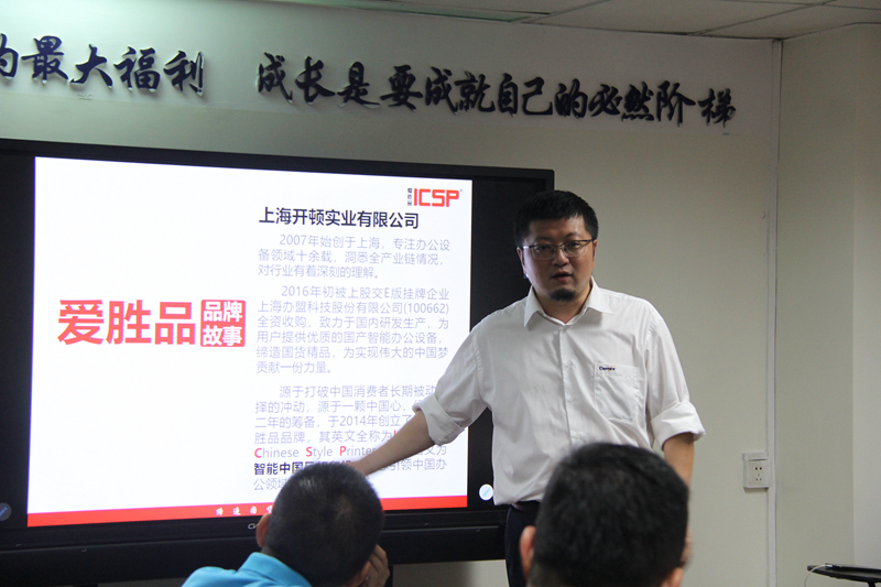 2019年10月21日,上海开顿实业有限公司的林总受邀来到广西宏道(赛盟)集团,为宏道(赛盟)伙伴介绍ICSP爱胜品激光打印机的相关知识,并和大家分享了一些实用的销售技巧。
